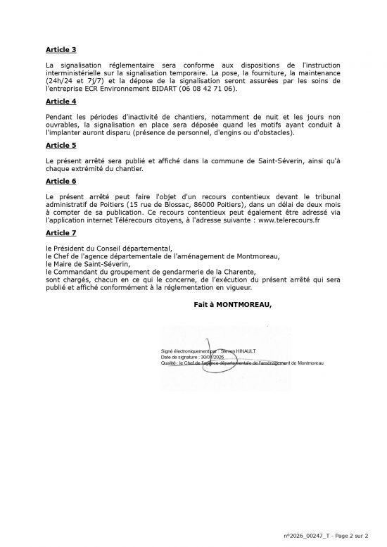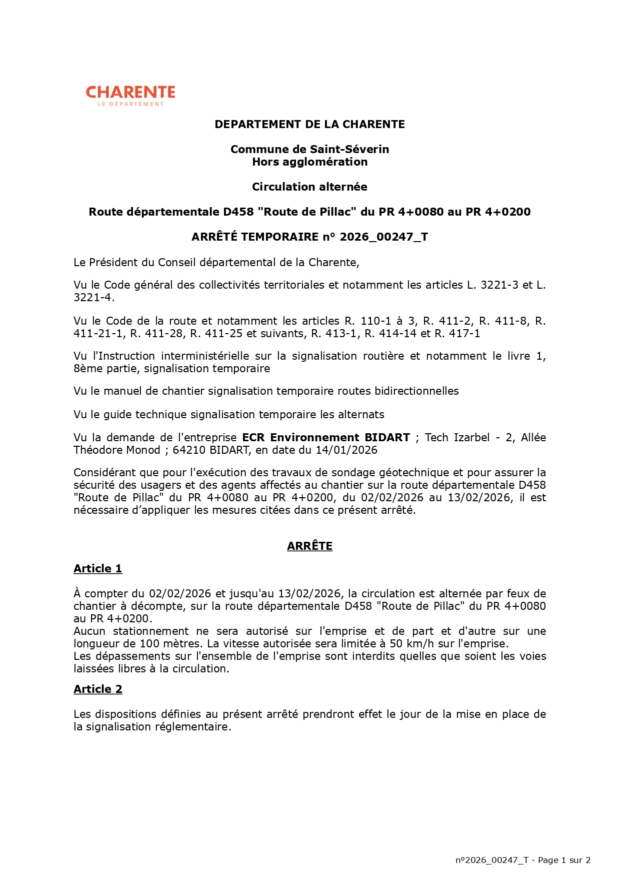 02 Fév Arrêté de circulation -Route départementale D458 “Route de Pillac” du 02/02/26 au 13/02/26 Publié à 17:02h dans Blog de Saint-Séverin par Mairie de Saint-Séverin Partager