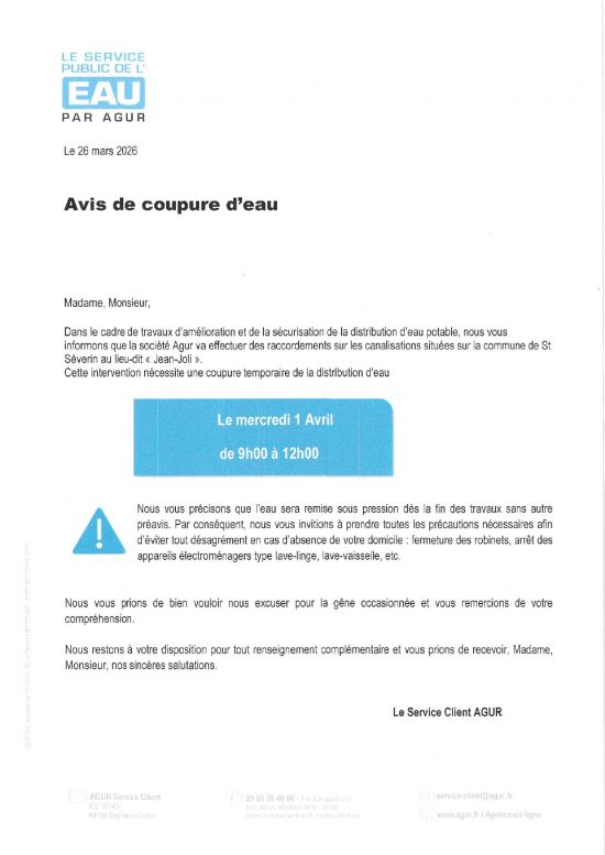 30 Mar COUPURE D’EAU 01/04/2026 Publié à 12:08h dans Blog de Saint-Séverin par Mairie de Saint-Séverin Partager