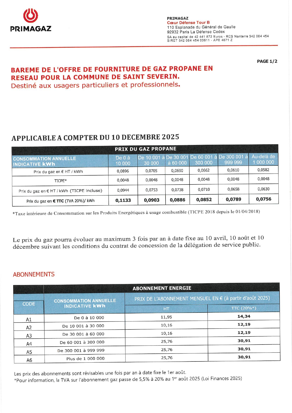 11 Déc Information PRIMAGAZ Publié à 09:13h dans Blog de Saint-Séverin par Mairie de Saint-Séverin Partager Barème de l’offre de fourniture de gaz propane en réseau pour la commune de Saint-Séverin. Primagaz