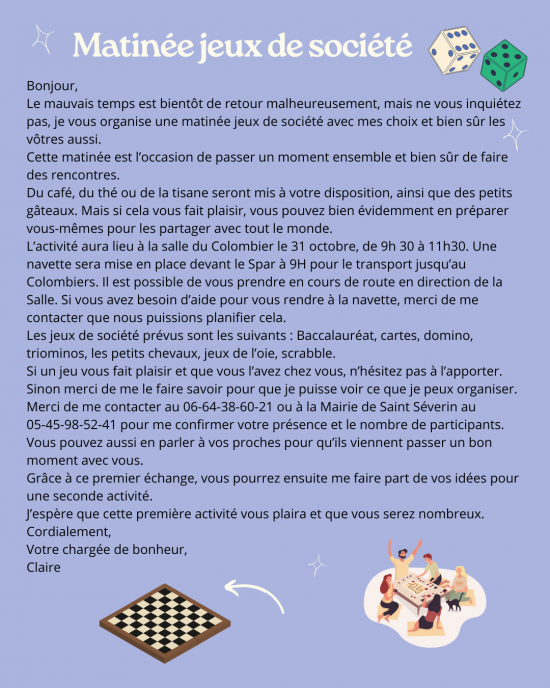 01 Oct Matinée jeux de société Publié à 20:55h dans Blog de Saint-Séverin par Mairie de Saint-Séverin Partager Tags: Jeux de société, Matinée, saint severin