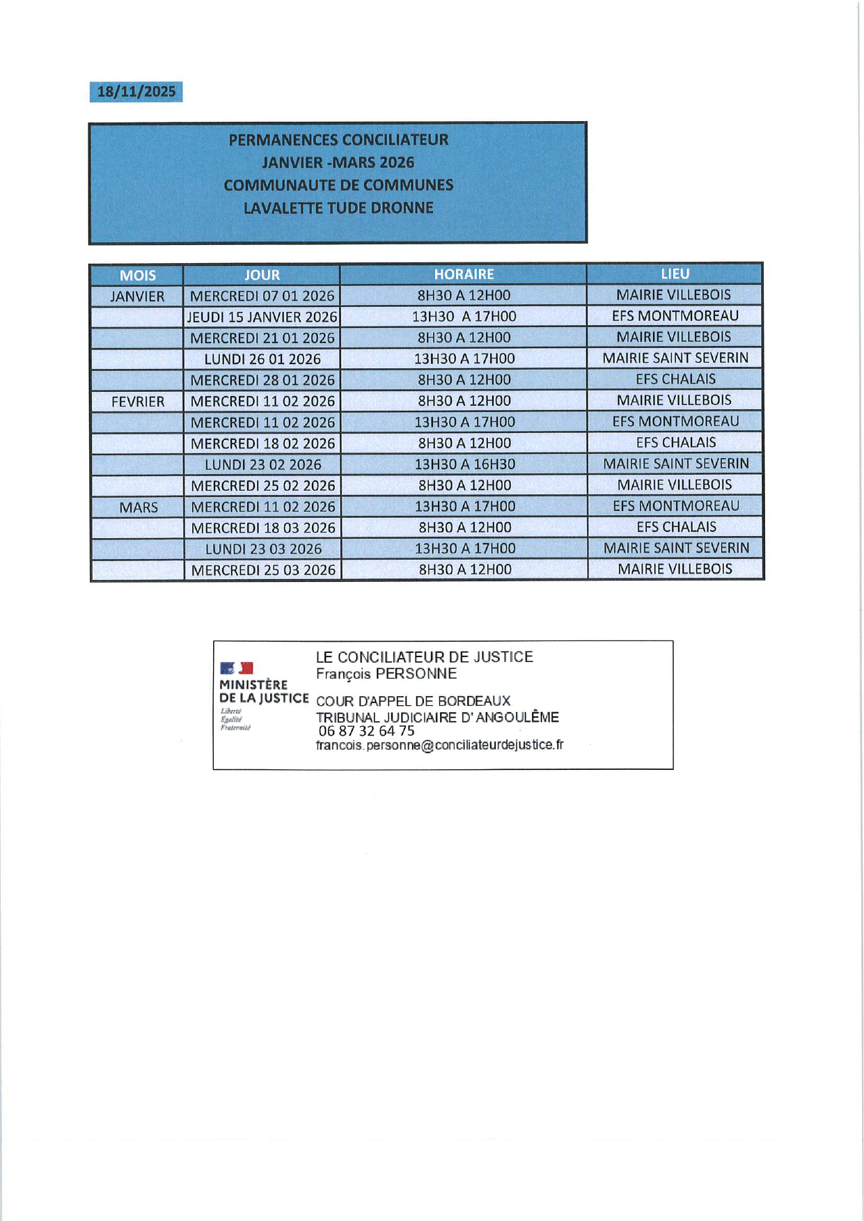 18 Nov Permanences conciliateur de justice CDC Lavalette Tude Dronne – Janvier à Mars 2026 Publié à 14:28h dans Blog de Saint-Séverin par Mairie de Saint-Séverin Partager