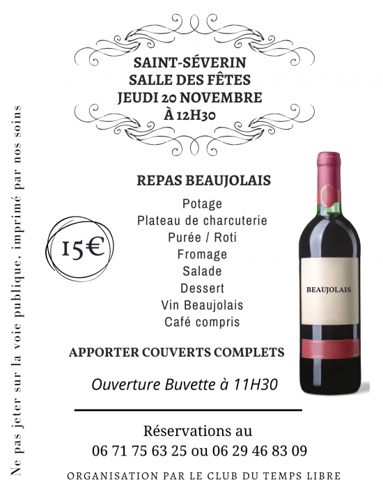 28 Oct Repas Beaujolais Publié à 21:09h dans Blog de Saint-Séverin par Mairie de Saint-Séverin Partager Tags: Club du Temps Libre, Repas beaujolais, saint-severin