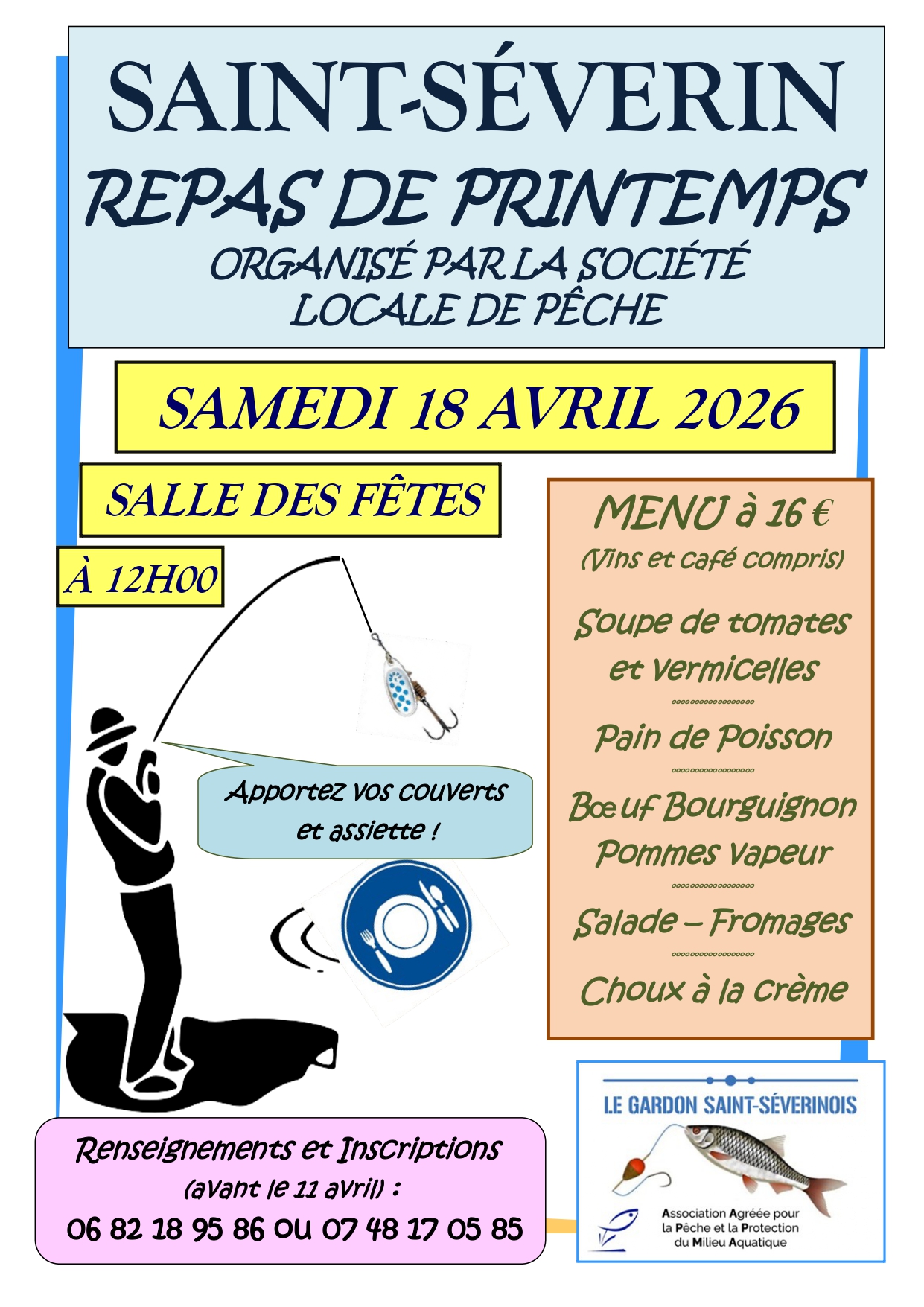 12 Mar Repas de printemps – 18/04/26 Publié à 09:41h dans Blog de Saint-Séverin par Mairie de Saint-Séverin Partager Repas de printemps organisé par la société de pêche Le Gardon Saint-Séverinois, le samedi 18 avril 2026 à 12H à la salle des fêtes de Saint-Séverin.