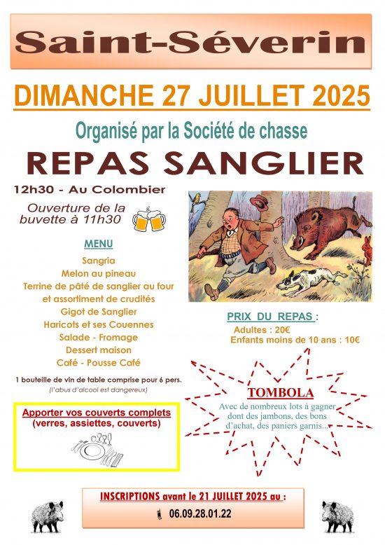 26 Juin Repas sanglier Publié à 14:26h dans Blog de Saint-Séverin par Mairie de Saint-Séverin Partager Tags: Repas sanglier, saint-severin, Société de chasse
