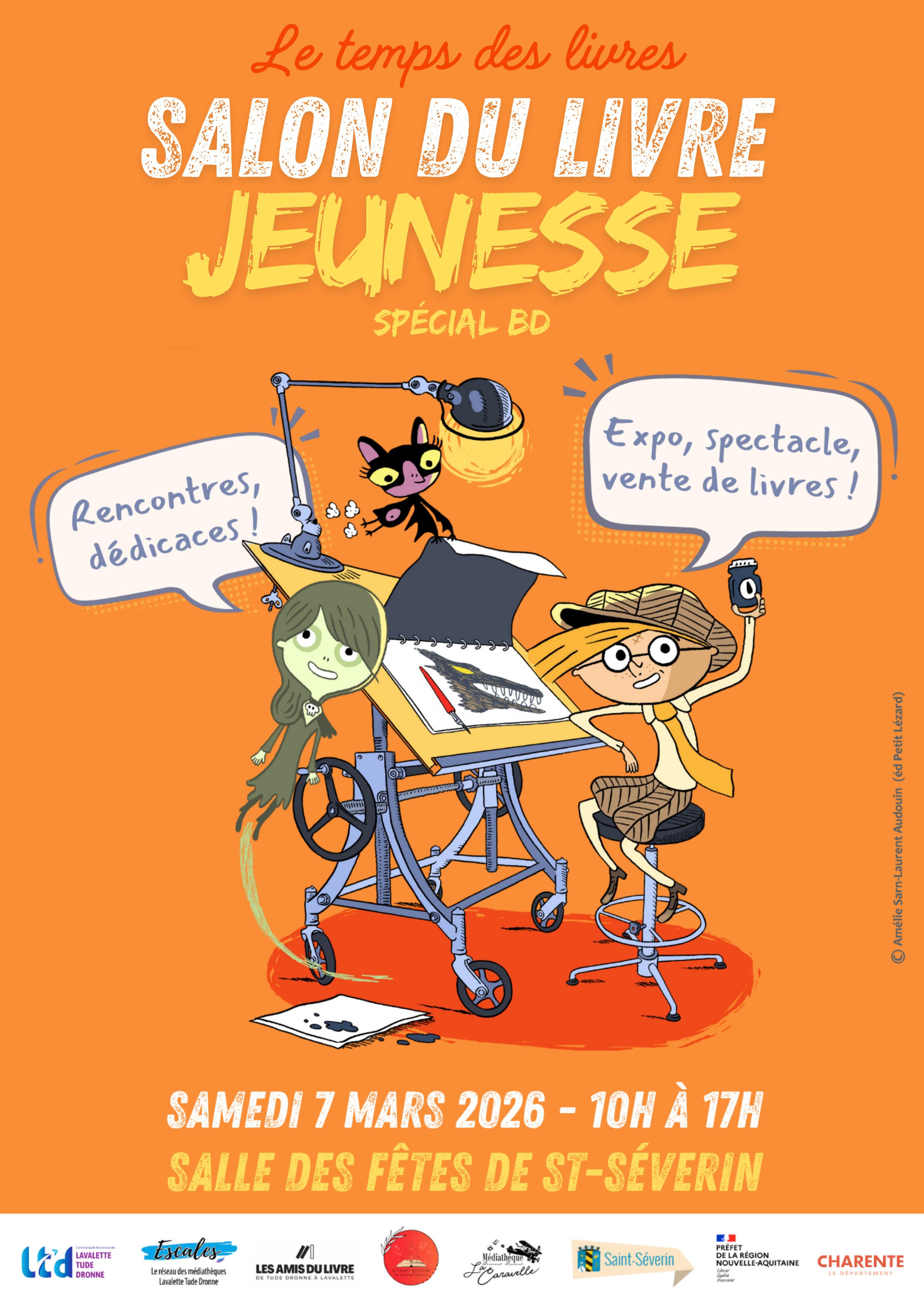 19 Fév Salon du livre jeunesse – spécial BD 07/03/26 Publié à 10:46h dans Blog de Saint-Séverin par Mairie de Saint-Séverin Partager Salon du livre jeunesse spécial BD le samedi 07 mars 2026 de 10H à 17H à la salle des fêtes de Saint-Séverin.