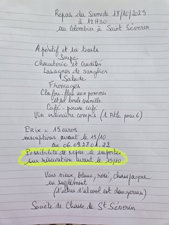 10 Oct Société de Chasse St Séverin Publié à 19:02h dans Blog de Saint-Séverin par Mairie de Saint-Séverin Partager Tags: saint-severin, Société de chasse